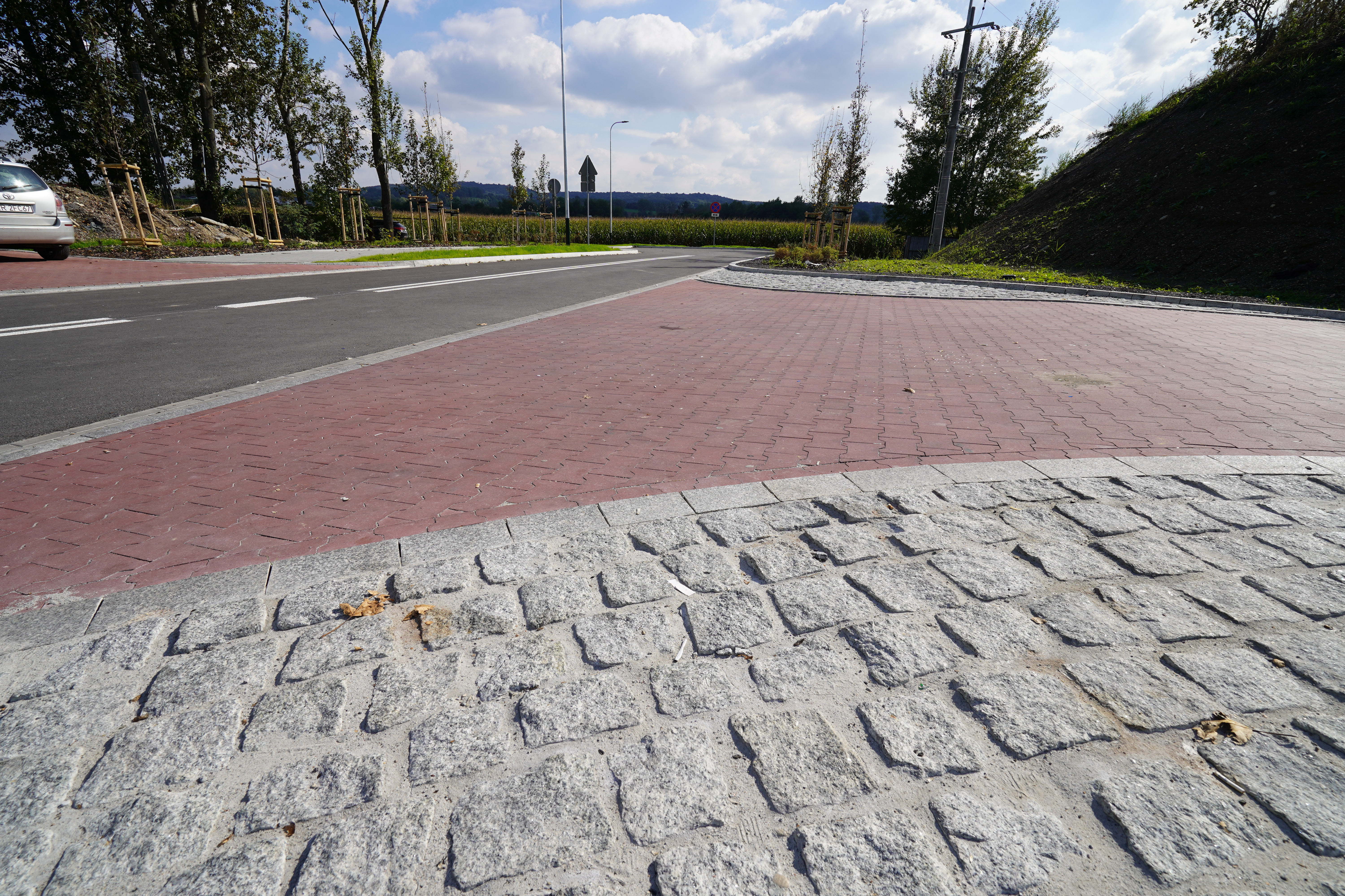 ZakończoneWykonanie nawierzchni z kostki betonowej na podbudowie z kruszywa łamanego wraz z ułożeniem krawężników na ławie betonowej i obrzeży. Dla podtrzymania nasypu ziemnego zastosowano murek oporowy z palisady w dwóch wysokościach posadowionych na ławie betonowej. W miejscu występowania najwyższej palisady, dla zabezpieczenia skarpy znajdującej się powyżej palisady ułożono płyty ażurowe. Roboty brukarskie w tym przypadku wymagały szczególnej precyzji wykonania.